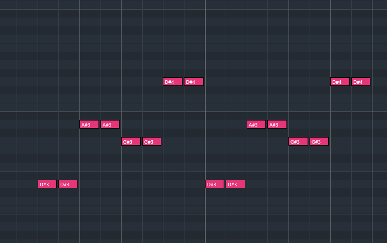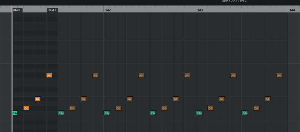 これは①8bit(右)のD# A# G# D# A# G# D# というフレーズの前半(D# A# G# D#)を引っ張って1小節に散らしているのだと思う