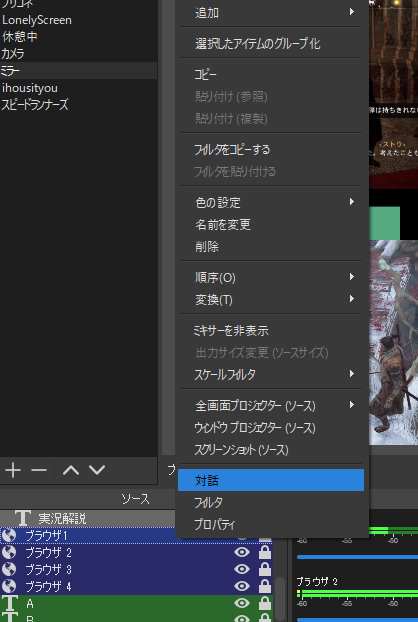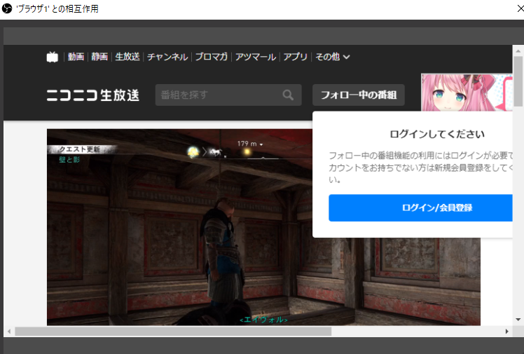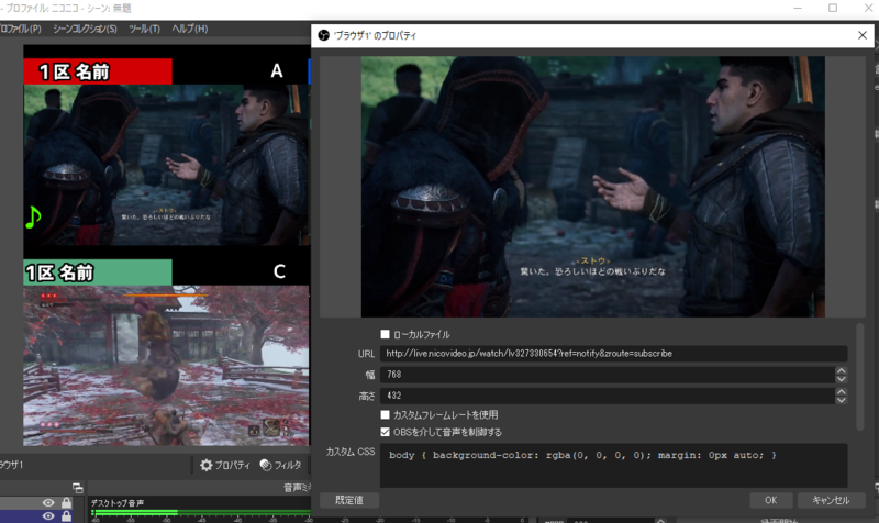 ここの「対話」というところを選択するとこのようにOBS上にブラウザのウインドウが開きます。