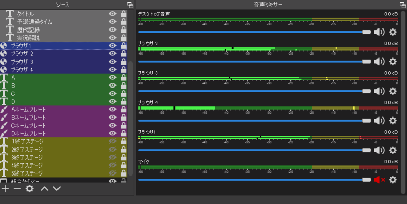 これをするとOBSの音量ミキサー上にブラウザの音声が現れ、ここで音量を調整できるようになります。