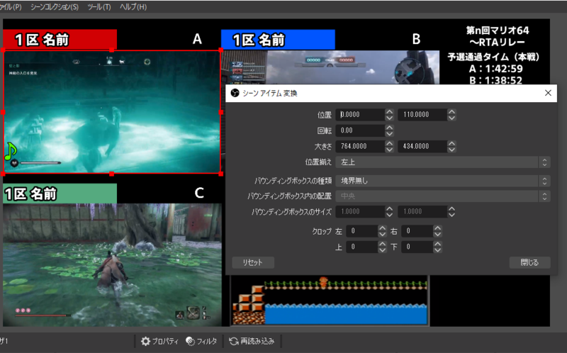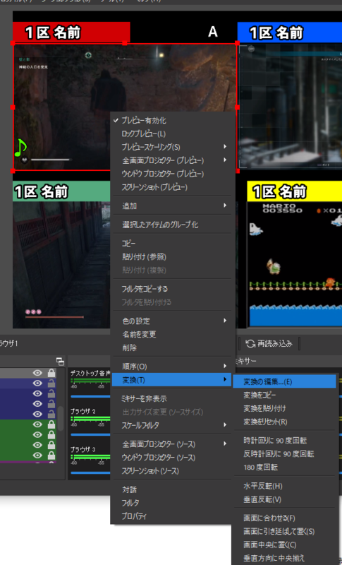 ブラウザソースを右クリックして「変換」→「変換の編集」を選択します。