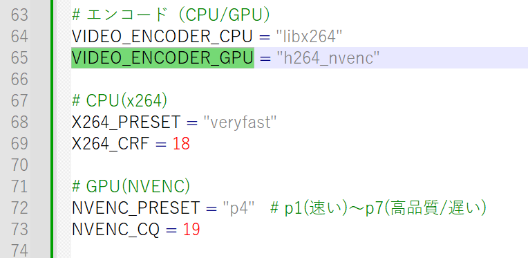 ちなみにGPUはNVIDIA製のGPUを対象にしています。AMDを使いたい場合は「twitch_nico.py」の「VIDEO_ENCODER_GPU」「NVENC_PRESET」「NVENC_CQ」を弄れば動くかもしれません。AMDのグラボを持っていないので検証できませんが。