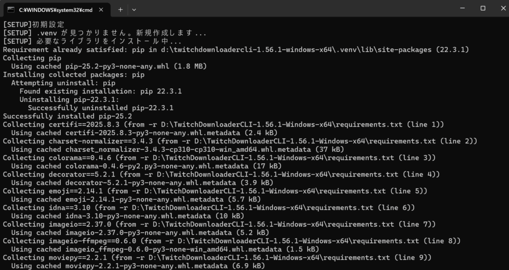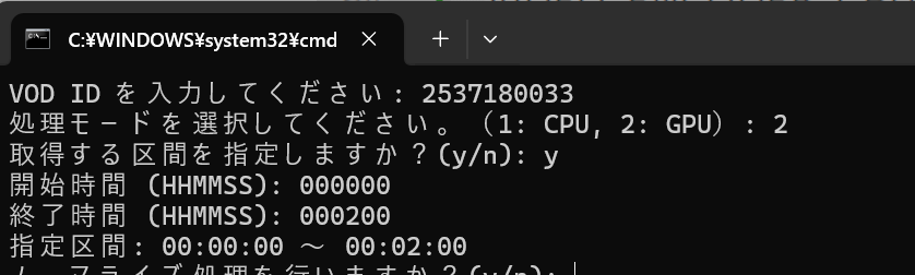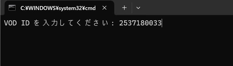 「TwitchDownloaderCLI」フォルダ内「run_twitch_nico.bat」をダブルクリックで実行します。