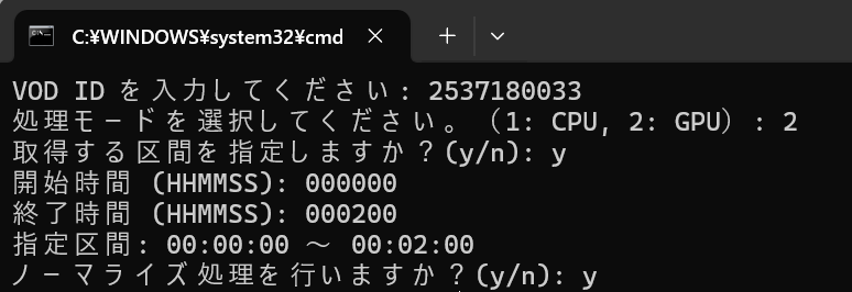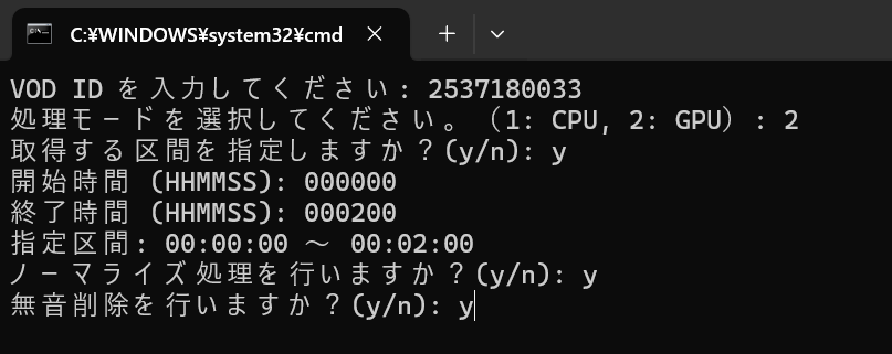 音量を音割れしないギリギリまで引き上げてくれる処理です(loudnorm)。はいなら「y」いいえなら「n」
