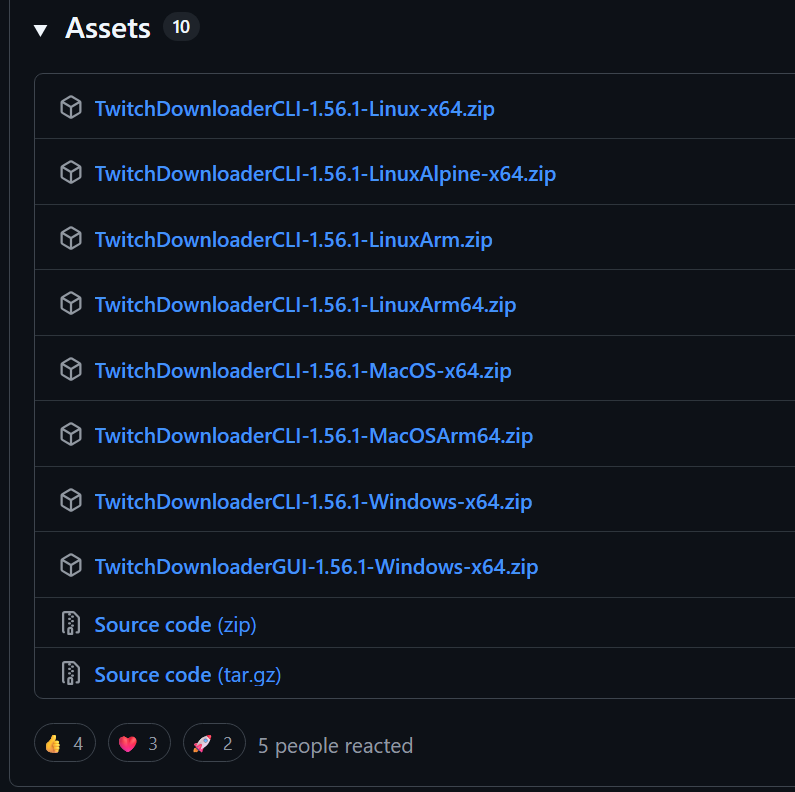 今回も使うのはCLI(コマンドで実行できるもの)なので「TwitchDownloaderCLI-1.xx.x-Windows-x64.zip」をダウンロードしてください。