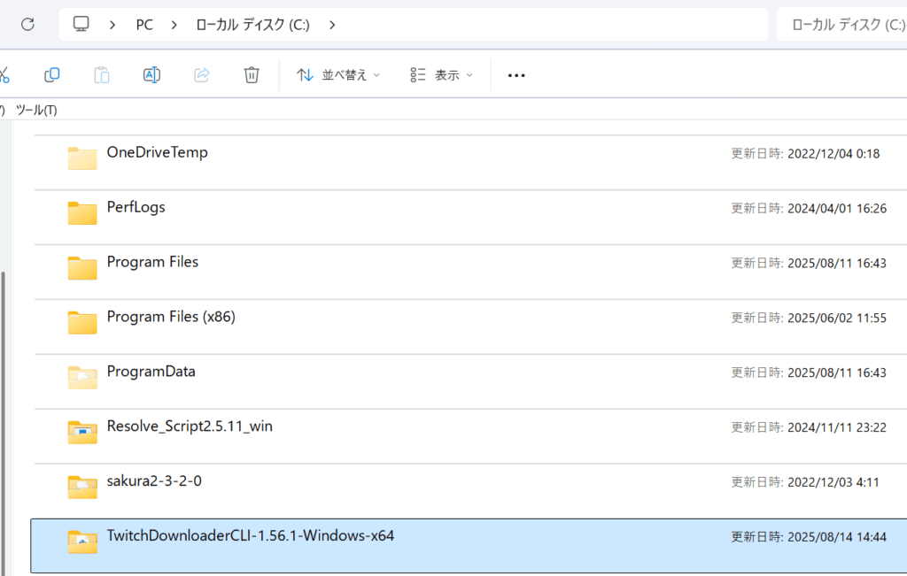 ダウンロードしたら解凍します。場所はどこでもいいですが私はCドライブ直下に配置しています。