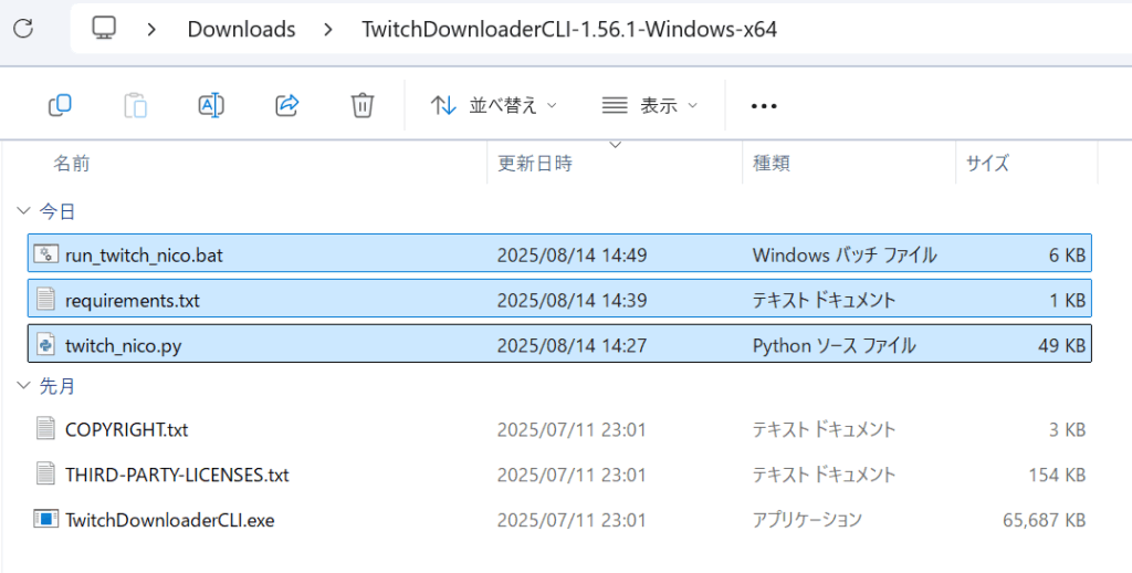 ダウンロードした「run_twitch_nico.bat」「twitch_nico.py」「requirements.txt」を「TwitchDownloaderCLI」フォルダ内に追加します。