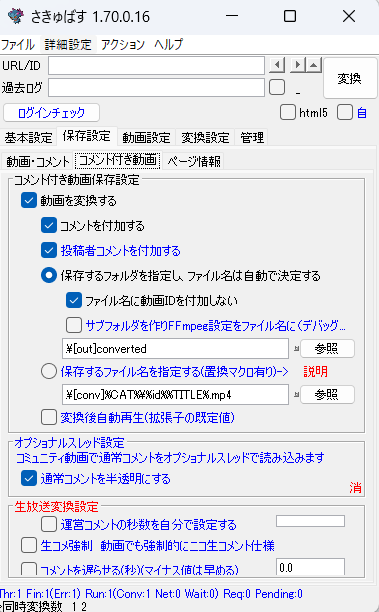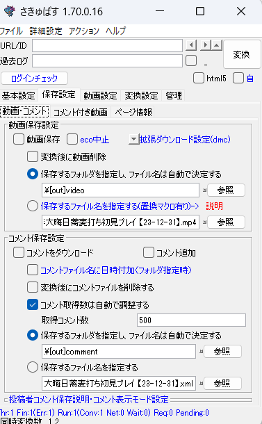 ・「コメント保存設定」の「保存するフォルダを指定し、ファイル名は自動で決定する」にチェックが入っており、参照先が「.\[out]comment」となっていることを確認