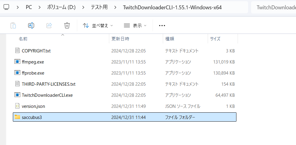 ダウンロードが完了したら解凍して、中にある「saccubus3」というフォルダを先ほどダウンロードした「TwitchDownloaderCLI」の中に入れます。