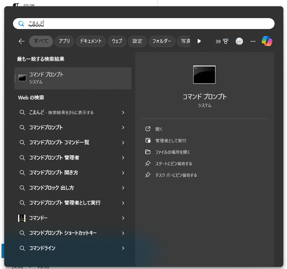 左下のwindowsアイコンからコマンドと入力してコマンドプロンプトを選択し実行します。