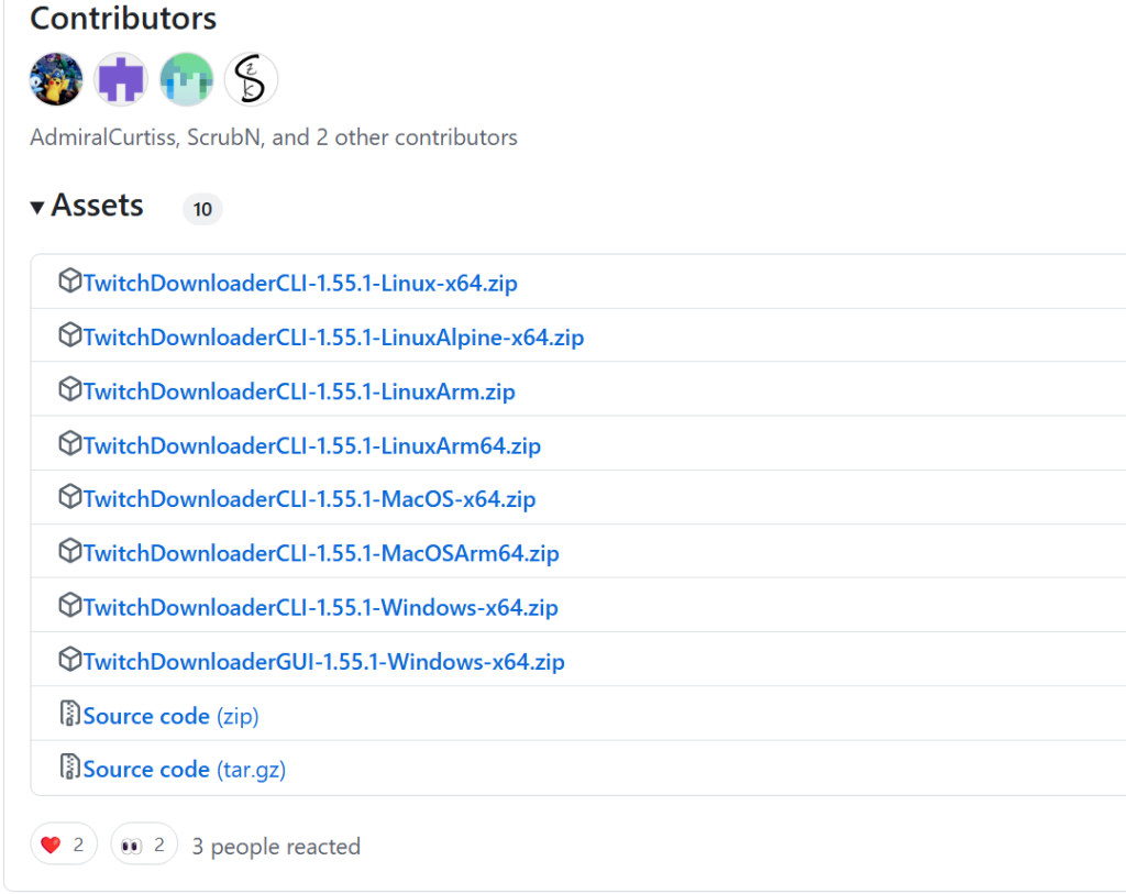 今回使うのはCLI(コマンドで実行できるもの)なので「TwitchDownloaderCLI-1.xx.x-Windows-x64.zip」をダウンロードしてください。