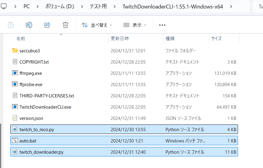 ダウンロードした「twitch_downloader.py」「twitch_to_nico.py」「auto.bat」を「TwitchDownloaderCLI」内に追加します。めっちゃ適当に書いたんで汚いです。許せ。