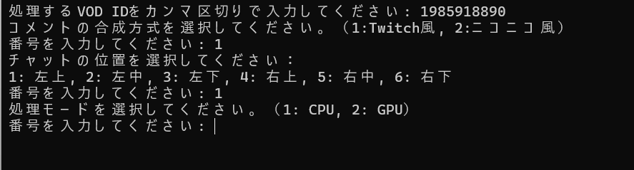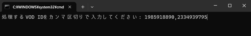 あとはEnterで実行されます。複数VOD IDを入力した場合は上で聞いた内容を元に処理を行うので何回も入力する必要はありません。