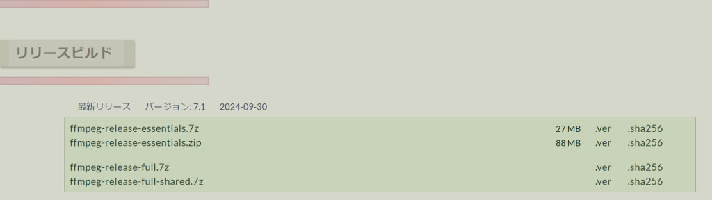 リリースビルドの最新リリースにある「ffmpeg-release-full.7z」を選択しダウンロード。