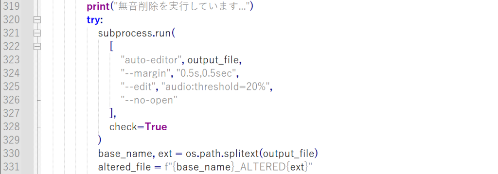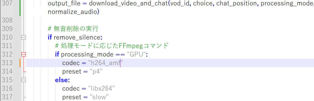 無音区間の削除についてですが、「twitch_downloader.py」325行目のthresholdを調整してあげることで、どれくらい音が小さかったらカットするのかというのを指定できます。