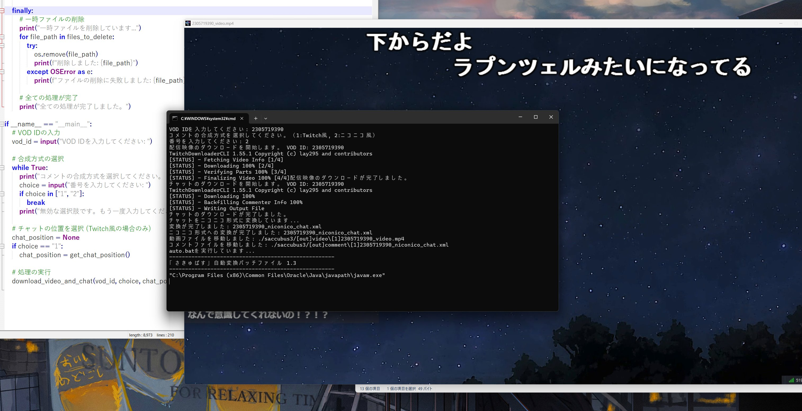 以前こちらの記事でTwitchの映像、チャットダウンロードからさきゅばすでのコメント合成の仕方を紹介したのですが、手順が多くてくそめんどくせぇってことで、自動化するコードを作成しました。